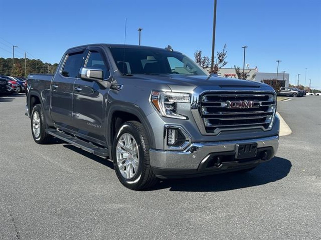 Check out this rugged and refined 2019 GMC Sierra 1500 SLT Crew Cab 4x4 in sophisticated Gray. Ready for work or play, it's powered by a robust EcoTec3 5.3L V8 paired with an 8-speed automatic transmission and Max Trailering Package-perfect for hauling and towing with confidence. Enjoy premium comfort with leather-trimmed, heated, and power-adjustable front seats, dual-zone automatic climate control, and a heated steering wheel. Stay connected and entertained on the road with the GMC Infotainment System, 8-inch touchscreen, Apple CarPlay/Android Auto, Bluetooth, SiriusXM, and built-in Wi-Fi hotspot. Convenience features include remote engine start, power-folding heated mirrors, chrome assist steps, spray-on bed liner, and the innovative MultiPro split-folding tailgate. Advanced safety tech like Driver Alert Package II, trailer brake controller, and rearview camera add peace of mind. This Sierra blends power, luxury, and technology in a versatile crew cab-your ideal truck for any adventure.